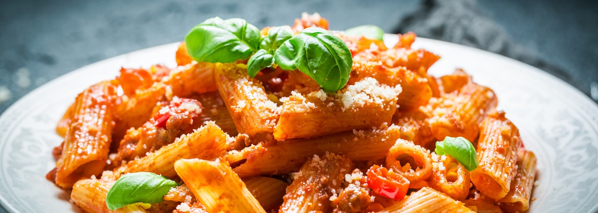 Ein simples aber sehr gutes Gericht sind Penne mit Tomatensauce und Basilikum, was in Italien oft als Vorspeise genossen wird.